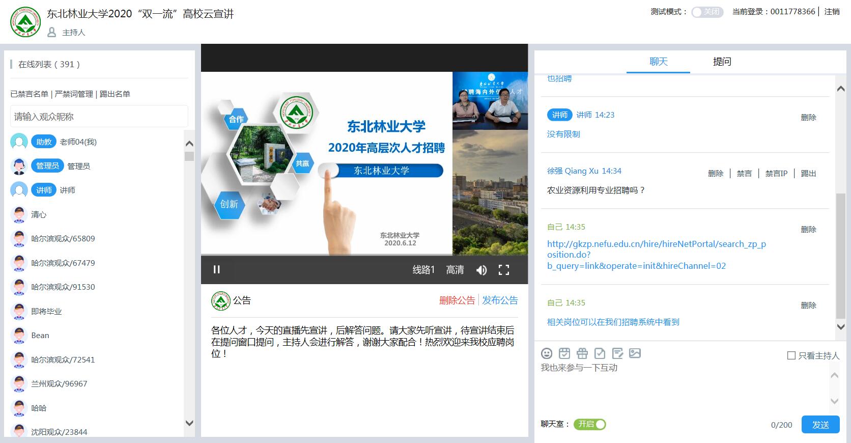 6月12日14:30,在奥林学院609会议室,面向全球的人才云招聘宣讲直播如期举行。400余名海内外学者相聚云端,观看宣讲直播并参与互动。
