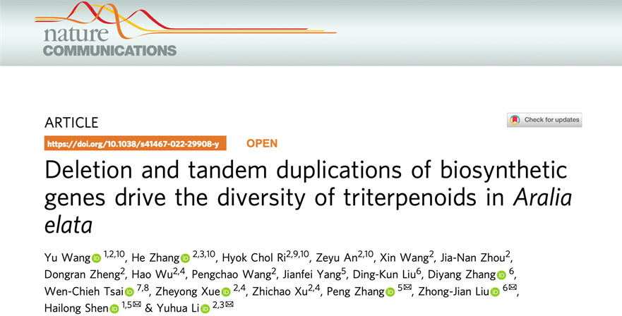 4月25日,我校生命科学学院李玉花教授团队联合林学院沈海龙教授团队在国际著名学术期刊Nature Communications《自然通讯》上发表了题为“Deletion and tandem duplications of biosynthetic genes drive the diversity of triterpenoids inAralia elata”的研究论文。首次报道由于达玛烯二醇合酶基因的缺失及三萜骨架位点特异性修饰酶的串联重复导致五加科植物龙牙楤木中积累丰富多样的五环三萜皂苷的分子与进化机制。Nature Communications是Nature出版集团旗下的国际顶级综合性学术期刊,最新影响因子14.919。本研究获得2022年度国家自然科学基金区域联合发展重点基金项目的支持。